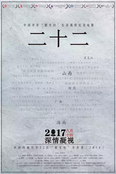 《二十二》这部纪录片记录了在中国生活的现存“慰安妇”的人生以及她们的记忆,第二次世界大战当时,在中国被强迫为“慰安妇”的20万人当中,现在仅剩22人。影片中包括被骗到中国,至今未回到自己家乡的朝鲜奶奶;一部份少数民族奶奶;也有被日本人俘虏的抗日女战士;她们每个人的故事相互关联,她们的经历不止局限于某个国家,而是影响着韩国、中国、日本以及亚洲其他地区的国家乃至全世界。