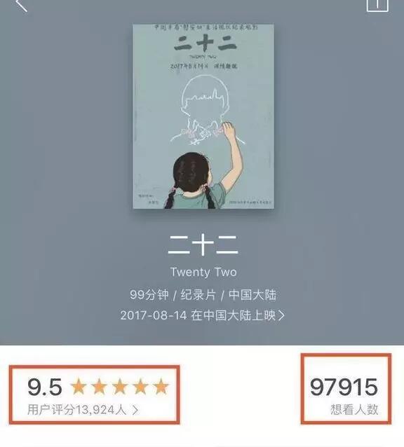 目前,《二十二》在豆瓣上评分高达9分,有超过三万人评价,其中超过6成的影迷给出五星评价。在淘票票评分上,这部电影的观众评分为9.5分,仅次于票房接近49亿的《战狼2》。
