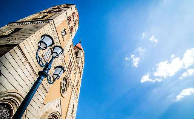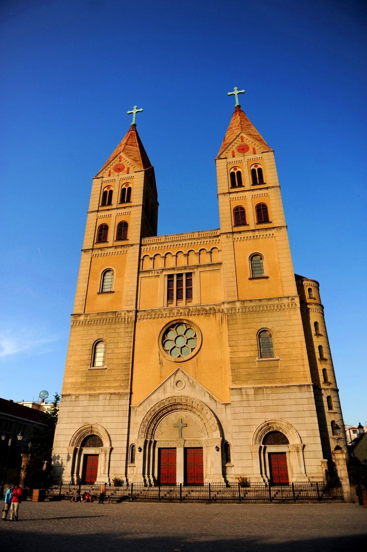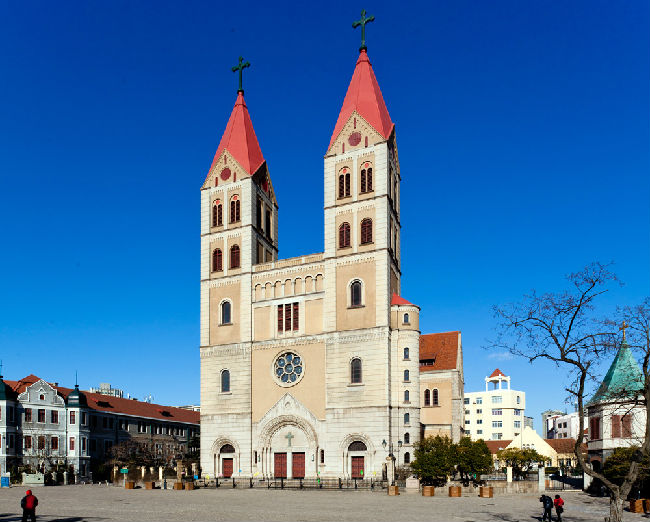 青岛天主教堂本名圣弥厄尔教堂,由德国设计师毕娄哈依据哥德式和罗马式建筑风格而设计。拟建教堂应高百米,适逢二战爆发,希特勒严禁德国本土资金外流,该教堂不得不修改图纸,即建成现在规模。教堂始建于1932年,于1934年竣工。塔身高56米,是建国前山东省最高的建筑。是中国唯一的祝圣教堂。
