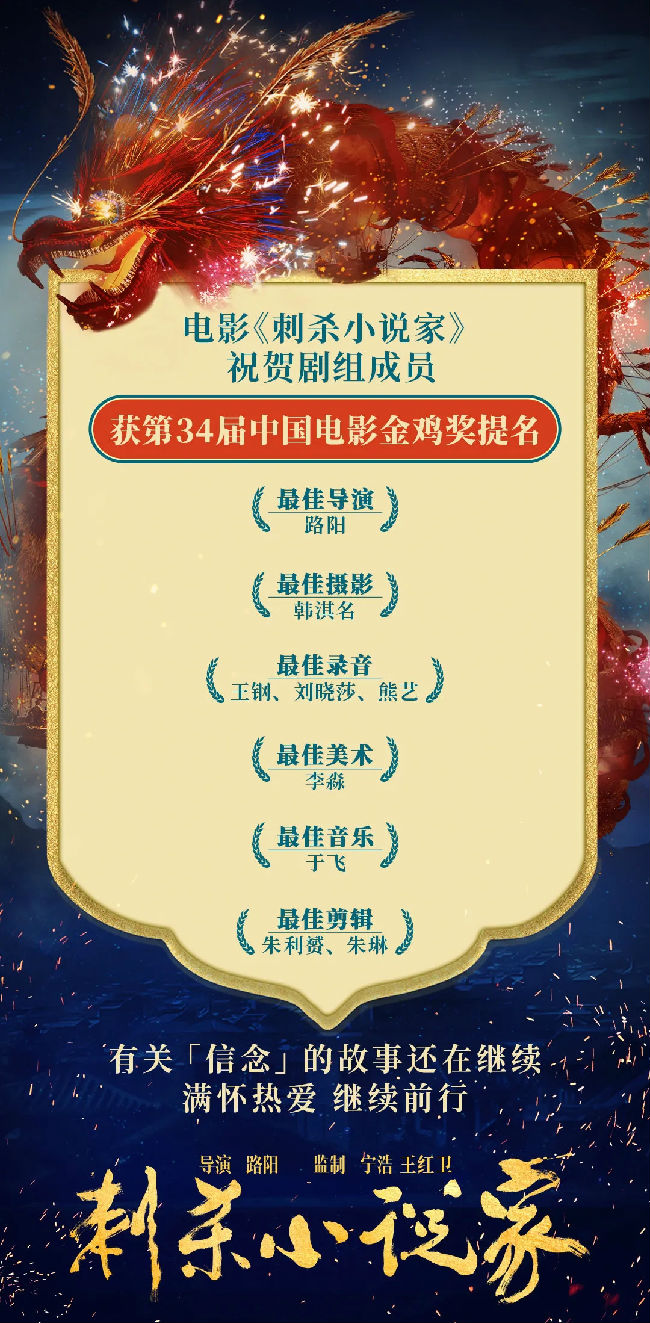 11月29日,2021年中国金鸡百花电影节官宣将于12月28日至30日在福建省厦门市举办,提名名单也一并发布。其中,由路阳执导,雷佳音、杨幂、董子健、于和伟等主演,在东方影都影视产业园置景拍摄的电影《刺杀小说家》获得最佳导演、最佳摄影、最佳录音、最佳美术、最佳音乐、最佳剪辑共六项提名!
