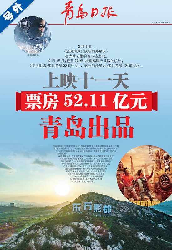 在青岛置景拍摄的《流浪地球》和《疯狂的外星人》两部超级科幻大片携手突出重围,“霸屏”春节档,登顶贺岁票房榜,成绩可喜,未来可期。青岛日报今日特推出号外版,以“‘科幻元年’青岛开启 ‘电影之都’看见未来”为主题,用四个整版的篇幅,深度解析这两部现象级国产科幻电影在青岛开启中国科幻元年的现象,聚焦电影之都青岛的前世今生,盘点青岛打造电影梦工厂的追梦之旅。