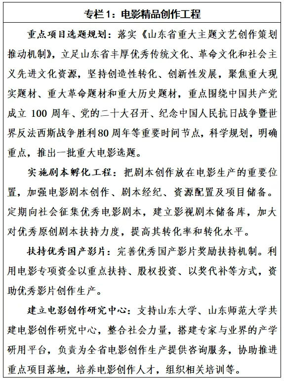 实施电影精品创作工程。重点项目选题规划,立足山东省丰厚优秀传统文化、革命文化和社会主义先进文化资源,聚焦重大现实题材、重大革命题材和重大历史题材,围绕中国共产党成立100周年、党的二十大召开、纪念中国人民抗日战争暨世界反法西斯战争胜利80周年等重要时间节点,推出一批重大电影选题;实施剧本孵化工程,建立影视剧本储备库,加大对优秀原创剧本扶持力度;扶持优秀国产影片,利用电影专项资金以重点扶持、股权投资、以奖代补等方式,资助优秀影片创作生产;支持山东大学、山东师范大学共建电影创作研究中心,为全省电影创作生产提供咨询等服务。