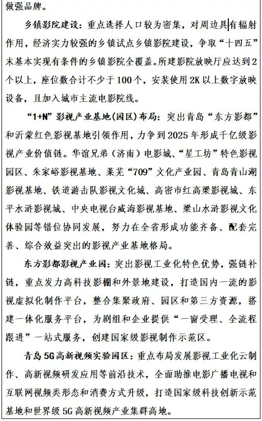 (四)健全完善电影工业体系。完善产业配套服务和电影工业体系建设,推动形成具有高技术支撑、高附加值的优质产业生态系统。以青岛灵山湾影视文化产业区为龙头,形成“1+N”影视基地(园区)布局,辐射带动一批主业明显、特色鲜明的影视产业园区。不断延展影视产业链条,积极培育新的增长点,擦亮“东方影都”名片,全力打造全国领先、世界水平的“电影之都”。办好青岛影视博览会、济南吴天明青年电影高峰会等重大电影节会活动。坚持运用高新技术推动电影发展,瞄准世界科技前沿,抢占技术创新高地,提高技术运用能力。