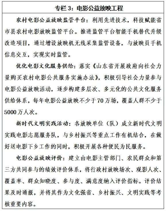 实施电影公益放映工程。利用先进技术,科技赋能省市县农村电影放映监管平台;积极引导社会力量参与电影公益放映活动,每年电影公益放映不少于70万场,覆盖人群不少于5000万人次;成立新时代文明实践电影志愿服务队,送电影下乡的同时开展好各种便民为民服务;建立由电影主管部门、农民群众和第三方共同参与的绩效评价体系,并将评价结果作为文化强省、乡村振兴、文明实践等考核重要内容。