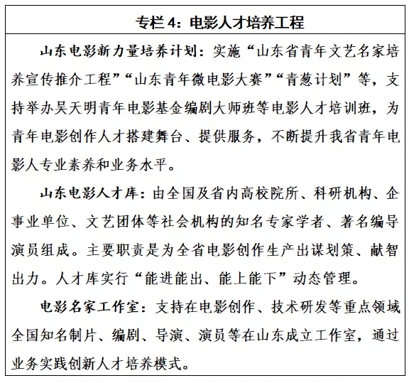 实施电影人才培养工程。实施“山东电影新力量培养计划”,为青年电影创作人才搭建舞台、提供服务;建设由省内外知名专家学者、著名编导演员组成的山东电影人才库,为全省电影创作生产献智出力;支持全国知名制片、编剧、导演、演员等在山东成立工作室。