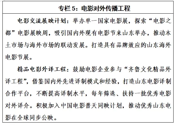 实施电影对外传播工程。通过探索举办电影展、电影展映周、吸引国内外现有电影节来山东举办等推动电影交流,打造具有品牌效应的山东海外电影节展;鼓励电影企业参与“齐鲁文化精品外译工程”,打造山东电影译制合作平台,每年筛选、扶持一批优秀电影对外译介;推动优秀山东电影在全球同步公映。