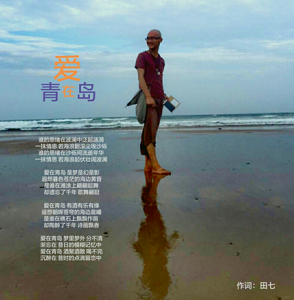 回忆2005年7月13日导演田七离别青岛回北京时创作 《水调歌头·青岛》“红瓦绿树依,碧海蓝天铸;信号台上迷雾,琴岛醉神独;八大关峡湖里,各地名语路冲,齐鲁一枝秀。石老人心忧,虾蟹暮中游。潮水涨,浪波退,展宏图;海鸥编飞舞,崂山道士休;青啤杯沁爽,风光企业无限,峡谷日奔流。夜乡觅知音,潇洒墨客求。”